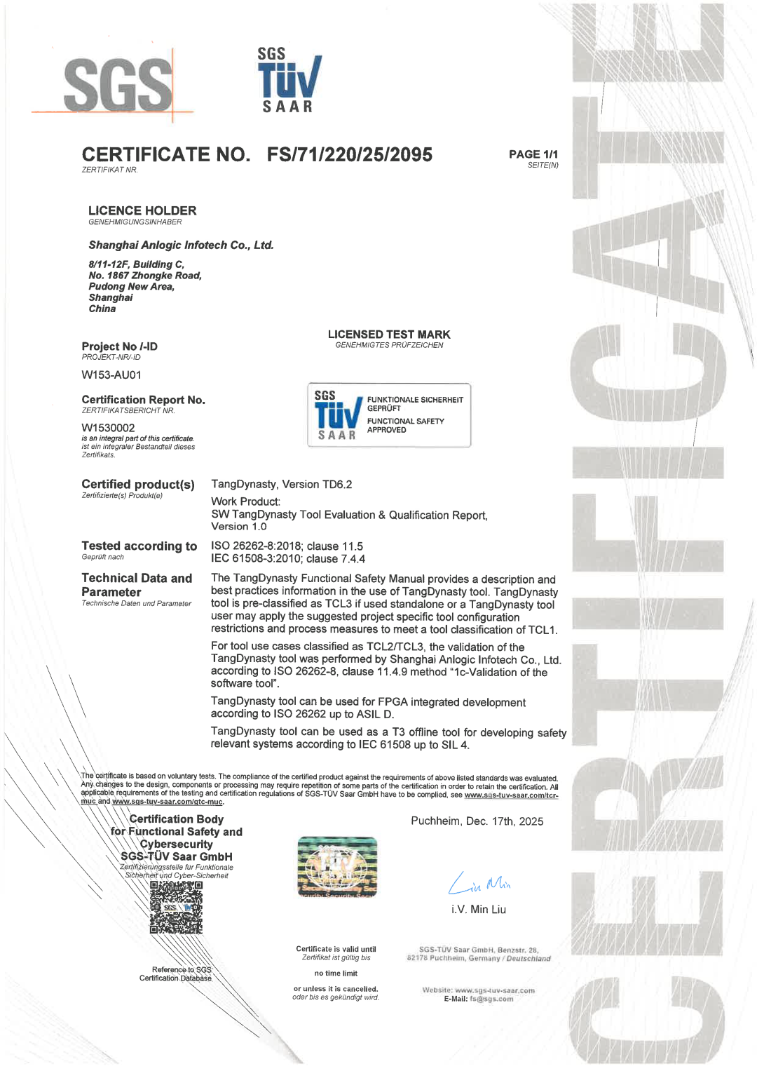 本次认证涵盖两大核心产品:TangDynasty专注于FPGA硬件开发,集成了Formal形式化验证等增强型安全措施;FutureDynasty则是面向FPSoC嵌入式软件开发的集成环境,深度符合功能安全流程规范。在ISO 26262标准下,当用户严格遵循产品手册中针对特定项目推荐的工具配置与流程措施后,工具置信度可提升至最高的TCL 1等级,从而支持ASIL D(汽车功能安全最高等级)和SIL 4(工业功能安全最高等级)的最高安全等级开发。两者共同构建了从设计到验证的全流程安全闭环。