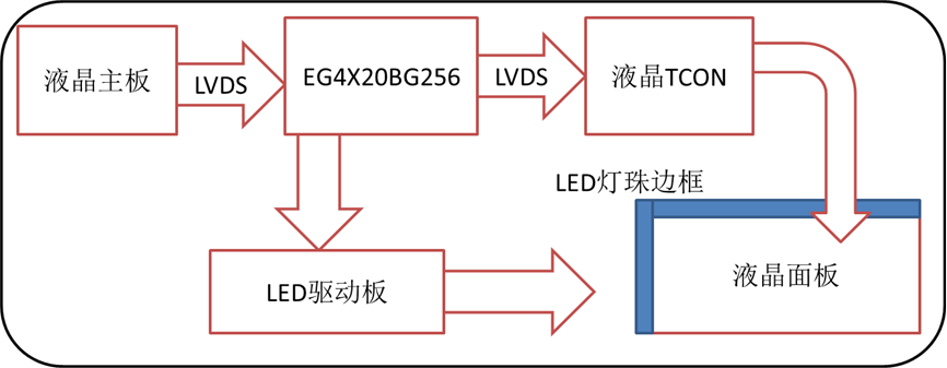 每个显示单元的系统框图如下图所示,FPGA负责接收来自主板的视频信号,然后将视频信号进行处理,分成液晶显示部分和LED显示部分,再分别输出给液晶TCON板去驱动液晶显示,和给LED驱动板去驱动LED显示。