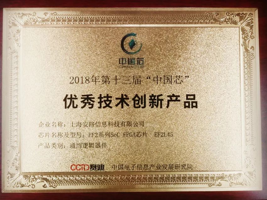 上海j9九游会官方信息科技有限公司参选的ELF2系列SOC FPGA芯片EF2L45荣获本届中国芯“优秀技术创新产品”称号。