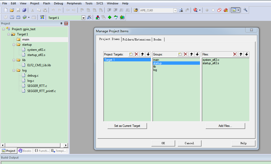 其中,startup组下的文件分别来自MCU\ELF2_BSP\Device\ELF2\Source和MCU\ELF2_BSP\Device\ELF2\Source\ARM目录下;lib组的文件来自MCU\ELF2_BSP\Driver;log组文件保存在MCU\ELF2_BSP\Debug和MCU\ELF2_BSP\Debug\RTT目录下。